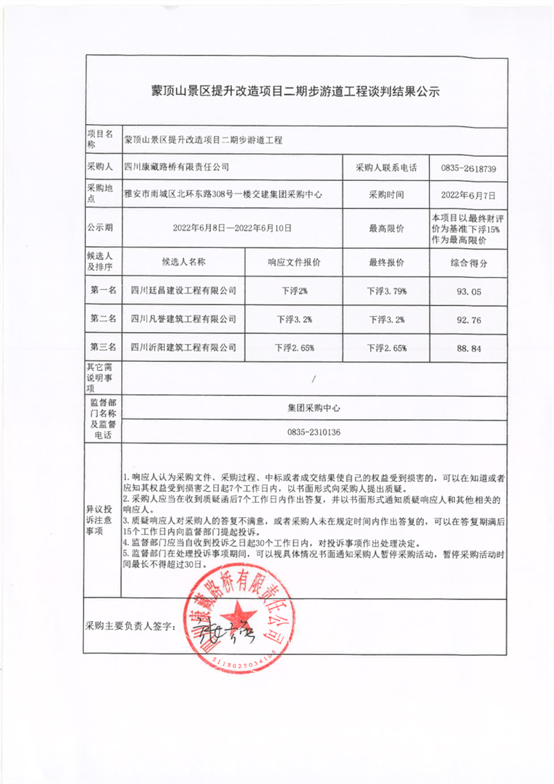 四川康藏路橋有限責任公司蒙頂山景區(qū)提升改造項目二期步游道工程談判結果公示