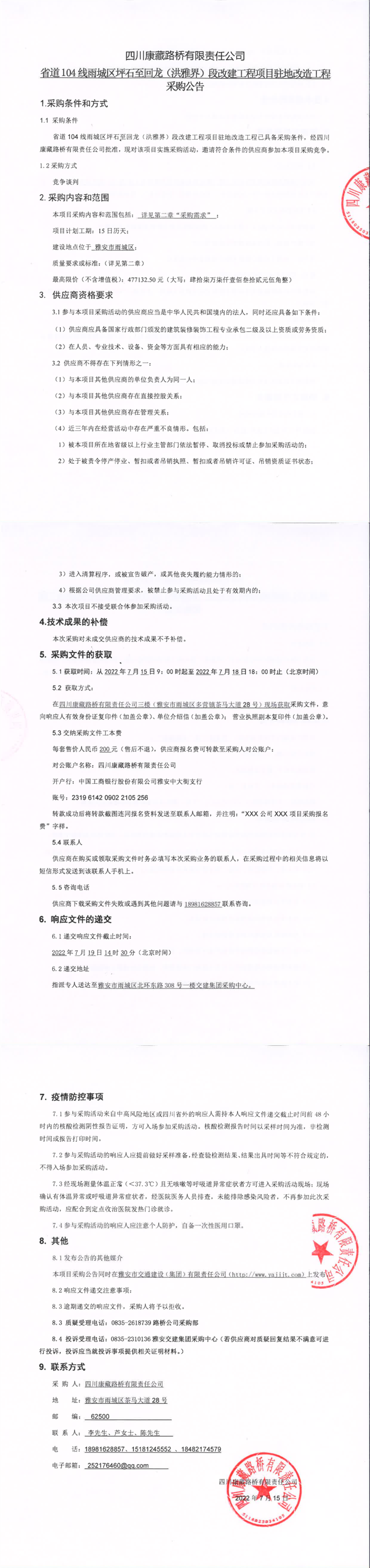 四川康藏路橋有限責任公司省道104線雨城區(qū)坪石至回龍(洪雅界)段改建工程項目駐地改造工程采購公告