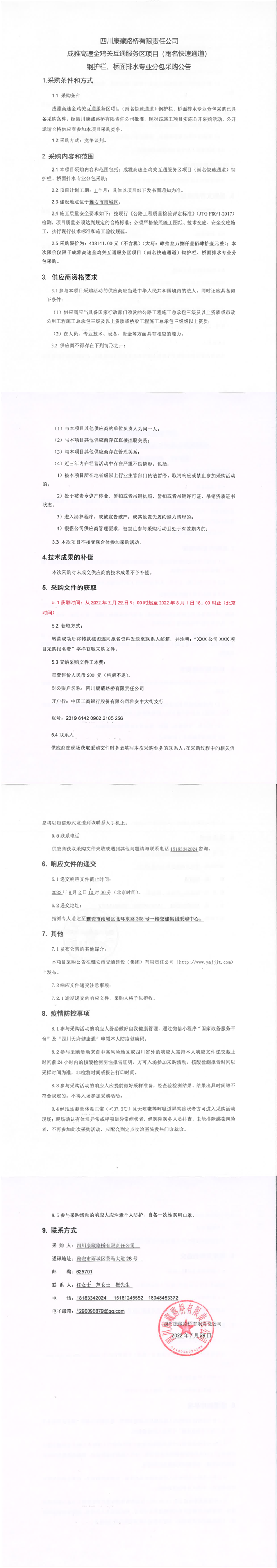 四川康藏路橋有限責任公司成雅高速金雞關(guān)互通服務(wù)區(qū)項目(雨名快速通道)鋼護欄、橋面攔水專業(yè)分包采購公告