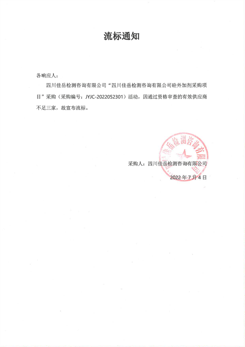 四川佳岳檢測咨詢有限公司砼外加劑采購項(xiàng)目流標(biāo)通知