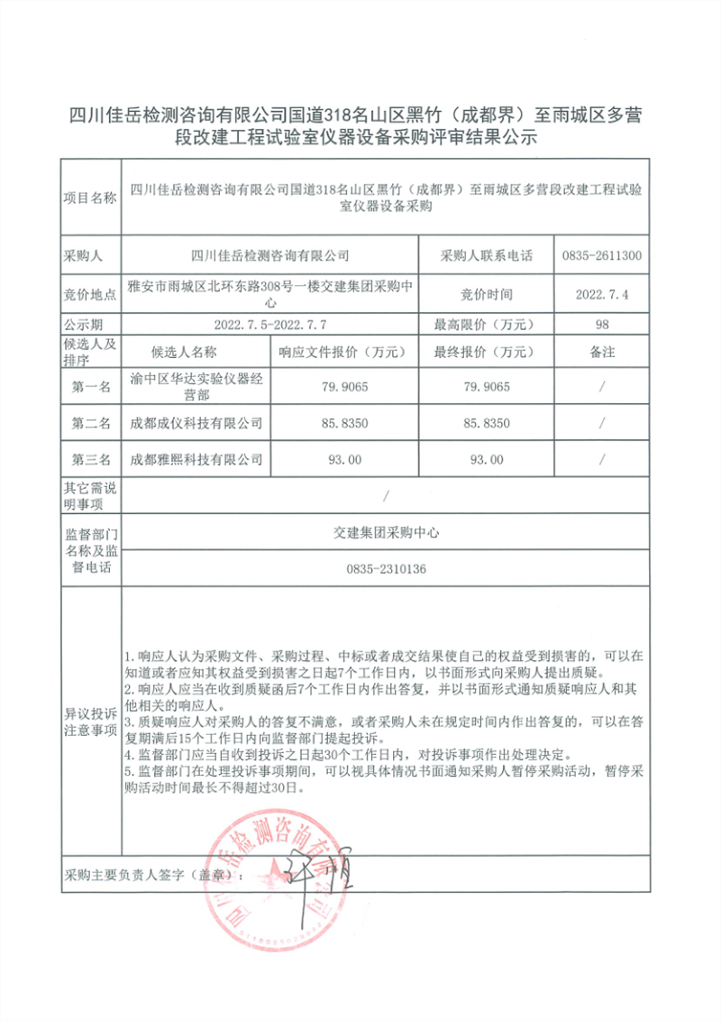 四川佳岳檢測咨詢有限公司國道318名山區(qū)黑竹(成都界)至雨城區(qū)多營段改建工程試驗室儀器設備采購評審結(jié)果公示