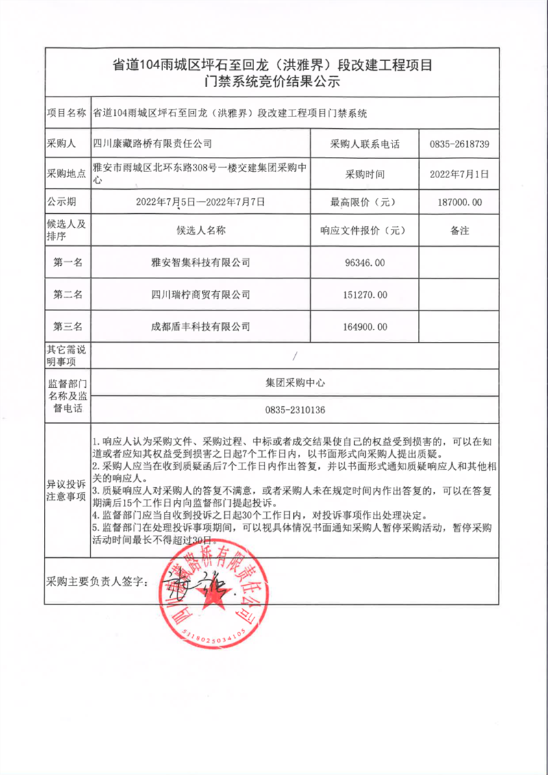四川康藏路橋有限責任公司省道104雨城區(qū)坪石至回龍(洪雅界)段改建工程門禁系統(tǒng)競價結果公示