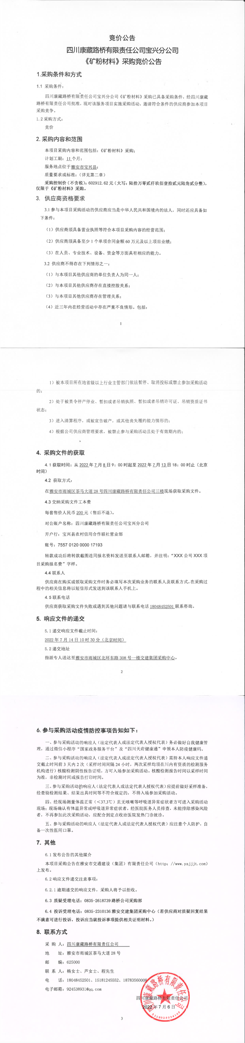 四川康藏路橋有限責(zé)任公司寶興分公司礦粉材料采購(gòu)競(jìng)價(jià)公告
