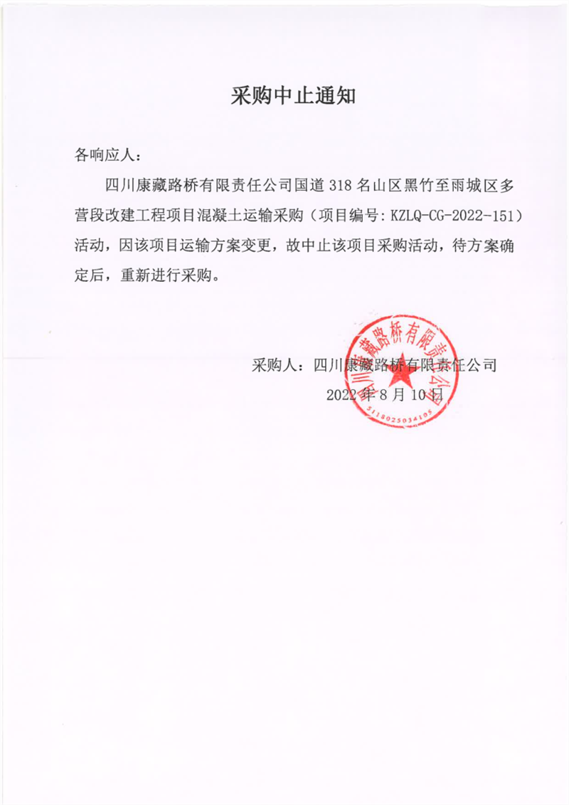 四川康藏路橋有限責(zé)任公司國(guó)道318名山區(qū)黑竹至雨城區(qū)多營(yíng)段改建工程項(xiàng)目混凝土運(yùn)輸采購(gòu)中止通知