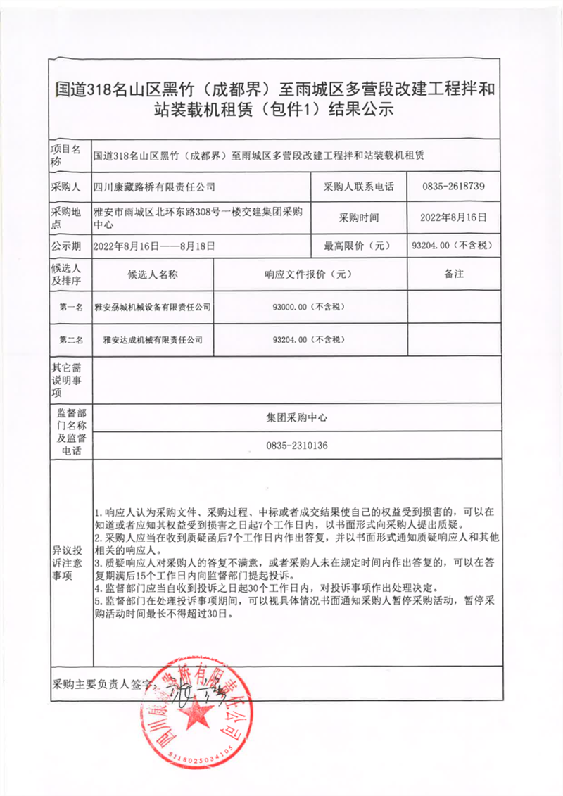 四川康藏路橋有限責(zé)任公司國道318名山區(qū)黑竹(成都界)至雨城區(qū)多營段改建工程拌和站裝載機(jī)租賃(包件1)結(jié)果公示