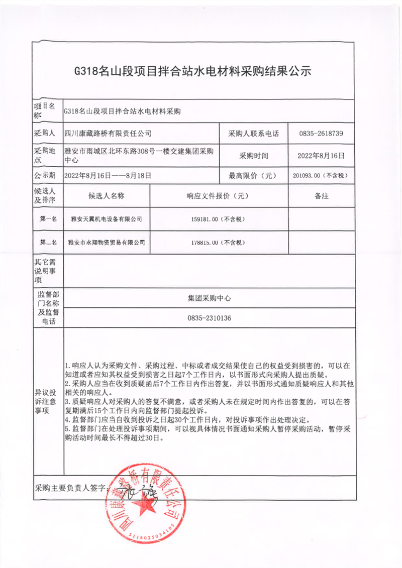 四川康藏路橋有限責任公司G318名山段項目拌合站水電材料采購結果公示