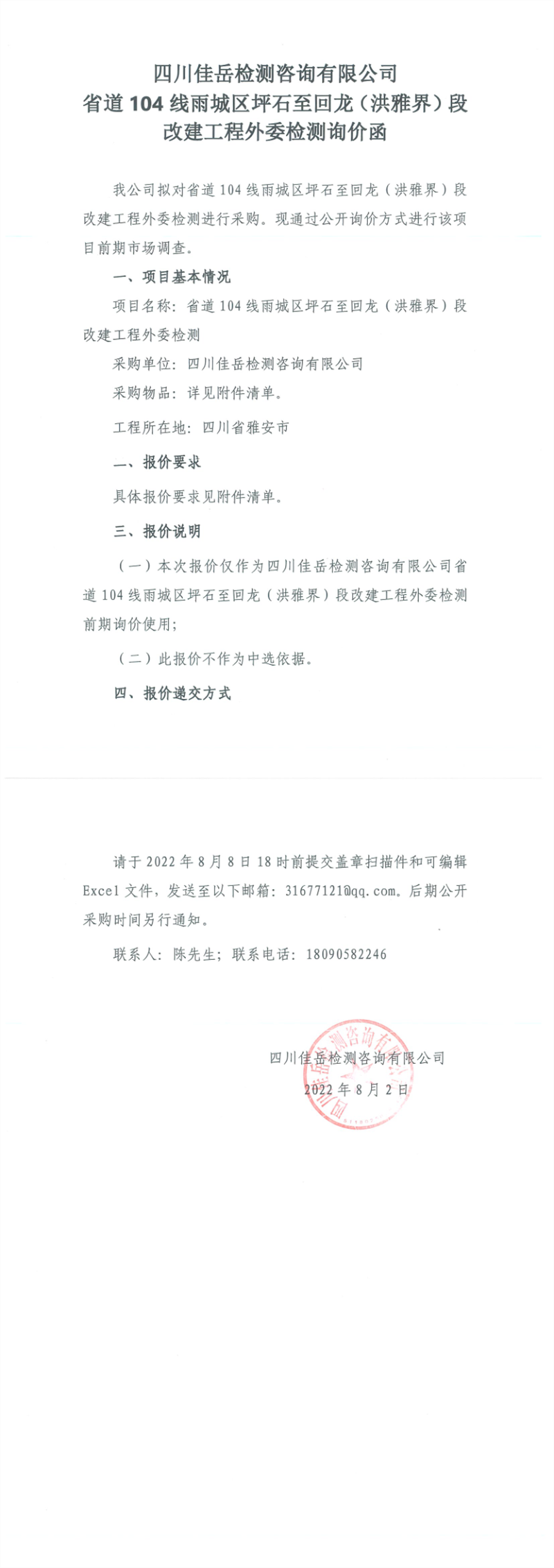四川佳岳檢測咨詢有限公司省道104線雨城區(qū)坪石至回龍(洪雅界)段改建工程外委檢測詢價(jià)函
