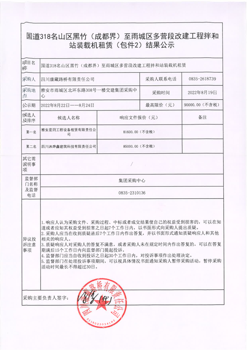 四川康藏路橋有限責(zé)任公司國道318名山區(qū)黑竹(成都界)至雨城區(qū)多營(yíng)段改建工程拌和站裝載機(jī)租賃(包件2)結(jié)果公示