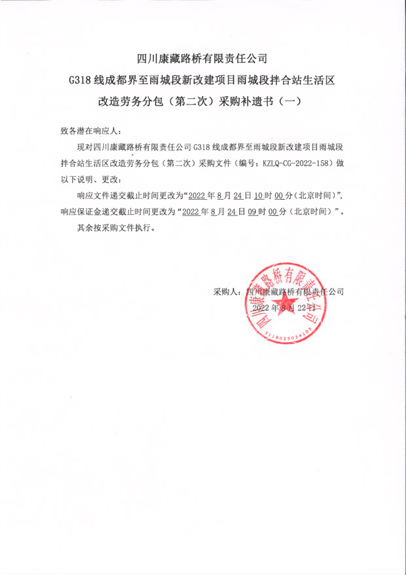 四川康藏路橋有限責(zé)任公司G318線成都界至雨城段新改建項目雨城段拌合站生活區(qū)改造勞務(wù)分包(第二次)采購補遺書(一)