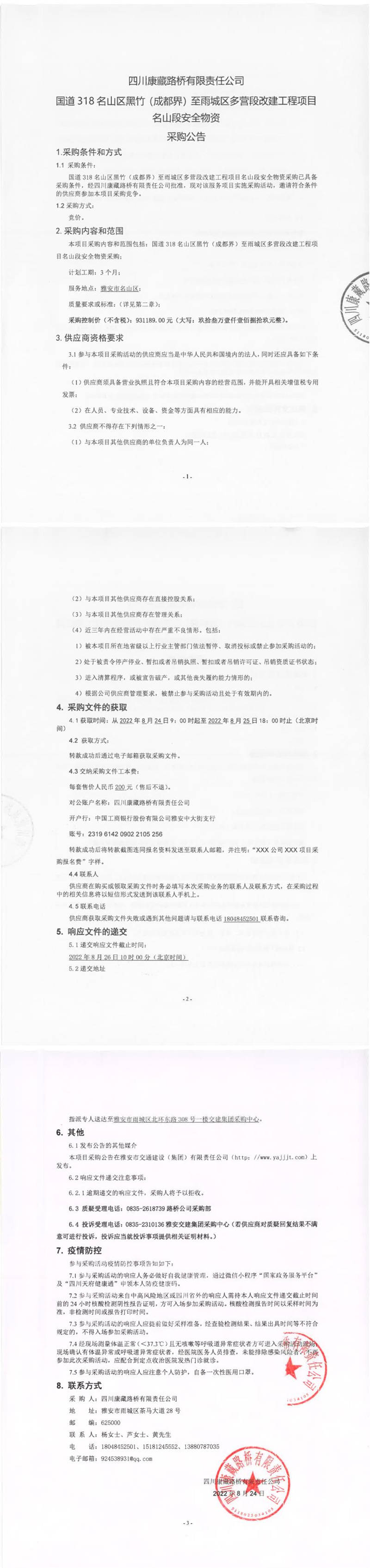 四川康藏路橋有限責(zé)任公司國道318名山區(qū)黑竹(成都界)至雨城區(qū)多營段改建工程項目名山段安全物資采購公告