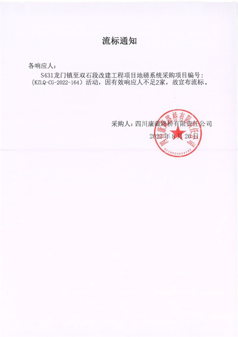 四川康藏路橋有限責(zé)任公司S431龍門鎮(zhèn)至雙石段改建工程項(xiàng)目地磅系統(tǒng)采購項(xiàng)目流標(biāo)通知