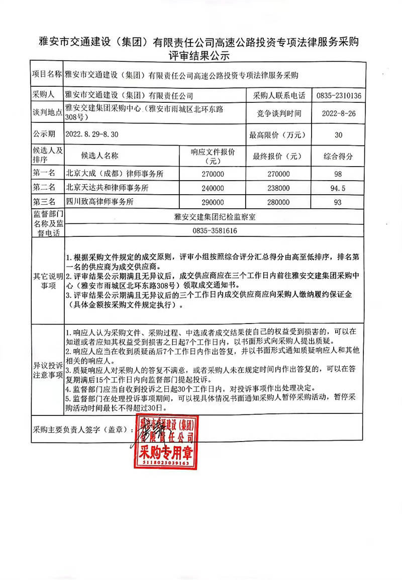 雅安市交通建設(shè)(集團(tuán))有限責(zé)任公司高速公路投資專項法律服務(wù)采購評審結(jié)果公示