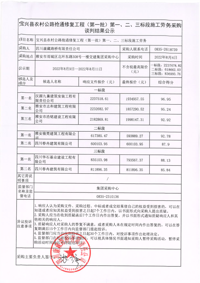 四川康藏路橋有限責任公司寶興縣農(nóng)材公路搶通修復工程(第一批)第一、二、三標段施工勞務談判結果公示