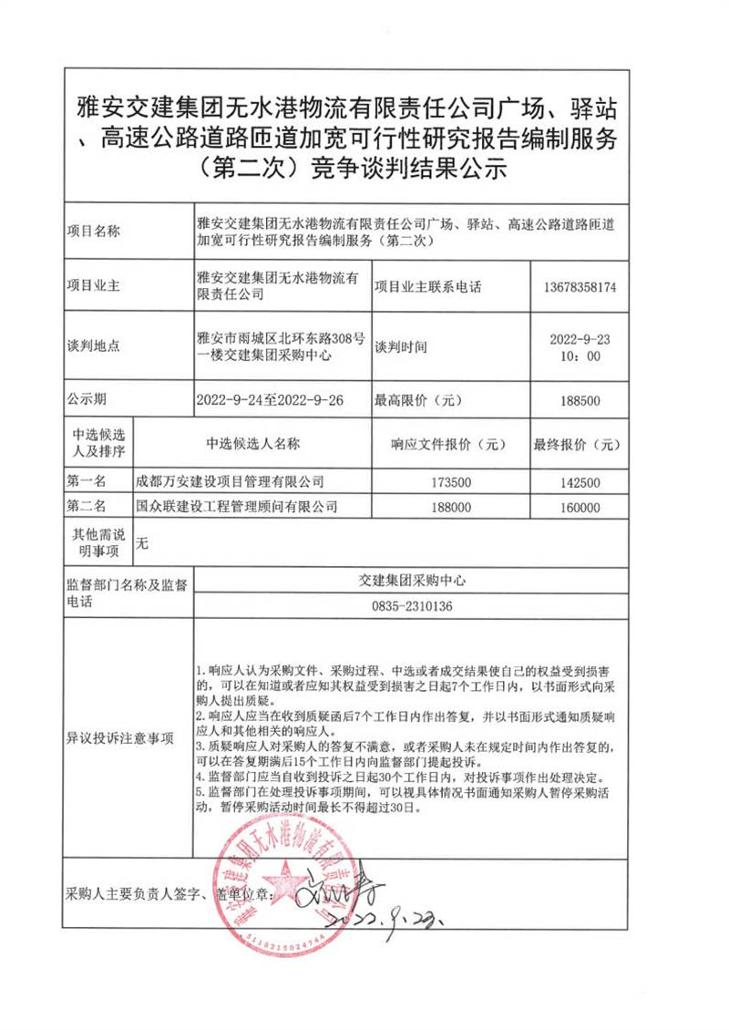 雅安交建集團無水港物流有限責任公司廣場、驛站、高速公路道路匝道加寬可行性研究報告編制服務(第二次)競爭談判結(jié)果公示
