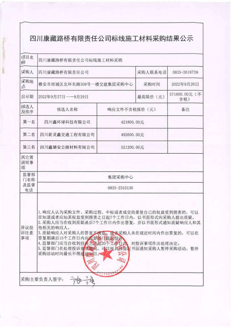 四川康藏路橋有限責(zé)任公司標(biāo)線施工材料采購(gòu)結(jié)果公示