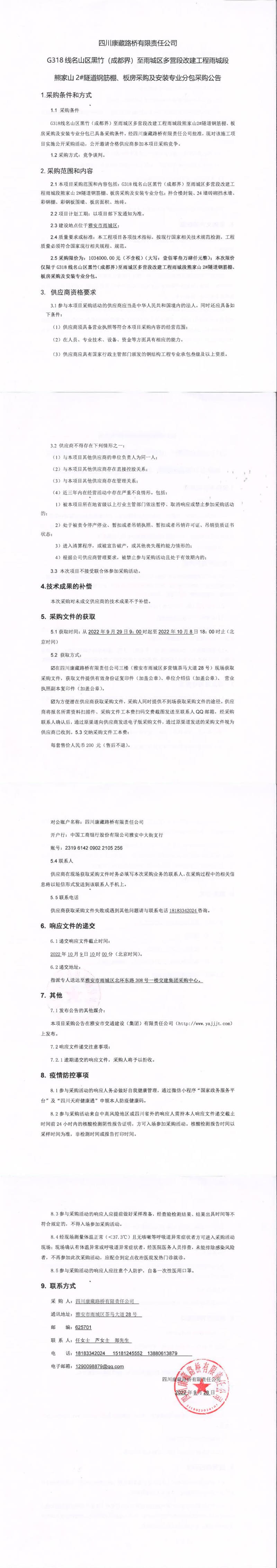 四川康藏路橋有限責(zé)任公司G318線名山區(qū)黑竹(成都界)至雨城區(qū)多營(yíng)段改建工程雨城段熊家山2#隧道鋼筋棚、板房采購(gòu)及安裝專業(yè)分包采購(gòu)公告