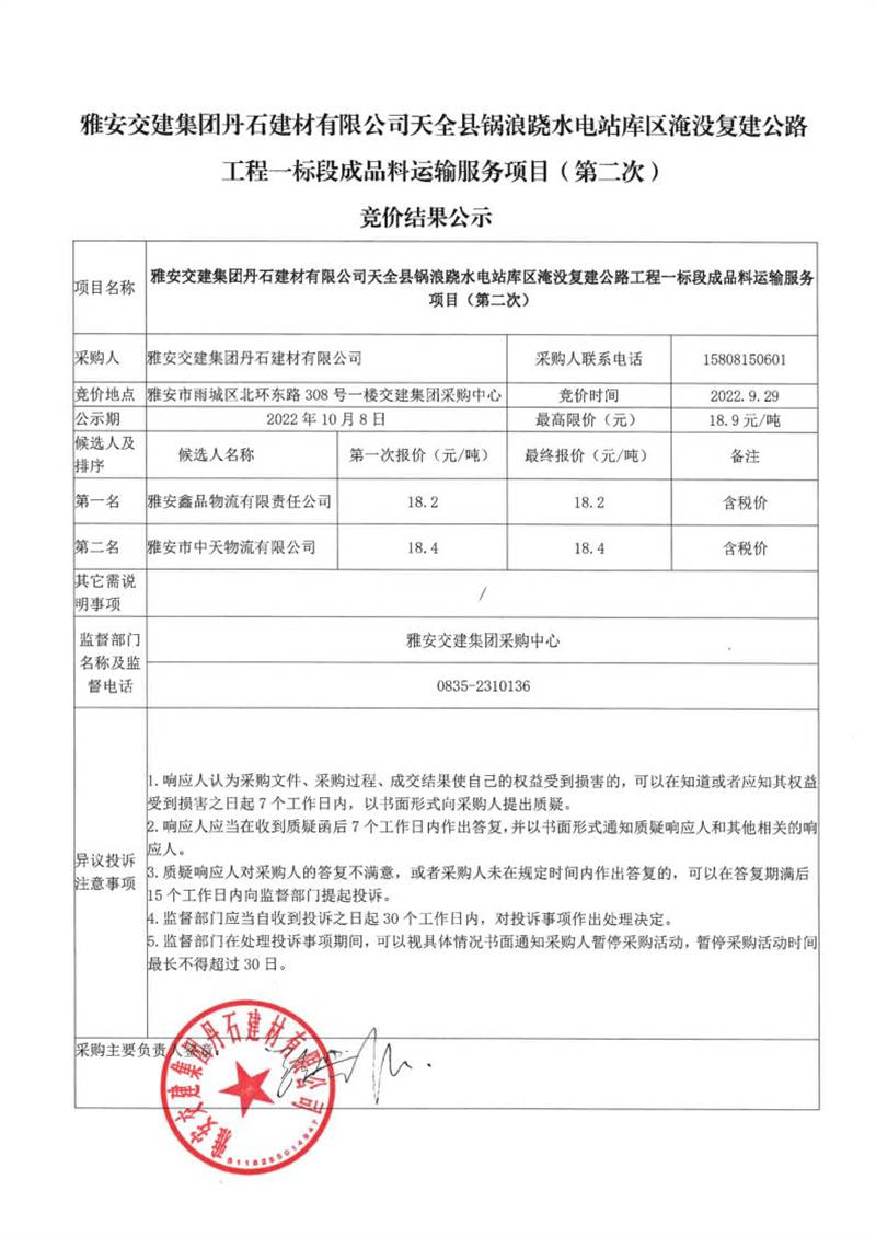 雅安交建集團(tuán)丹石建材有限公司天全縣鍋浪蹺水電站庫(kù)區(qū)淹沒(méi)復(fù)建公路工程一標(biāo)段成品料運(yùn)輸服務(wù)項(xiàng)目(第二次)競(jìng)價(jià)結(jié)果公示