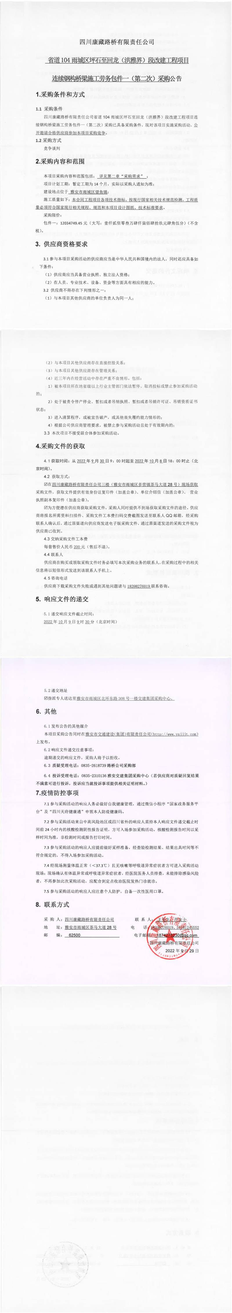 四川康藏路橋有限責任公司省道104雨城區(qū)坪石至回龍(洪雅界)段改建工程項目連續(xù)鋼構(gòu)橋梁施工勞務(wù)包件一(第二次)采購公告