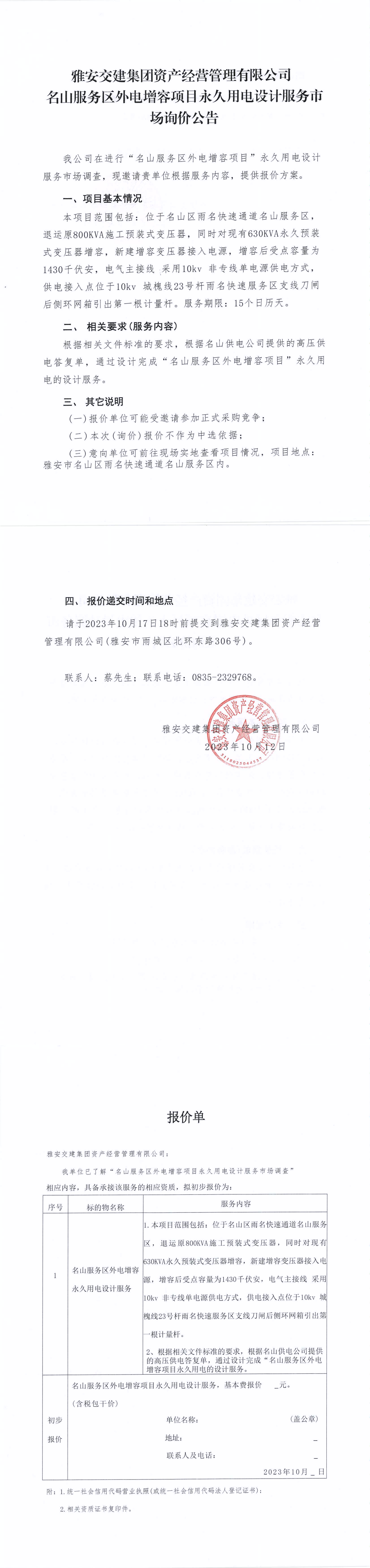 雅安交建集團(tuán)資產(chǎn)經(jīng)營管理有限公司名山服務(wù)區(qū)外電增容項(xiàng)目永久用電設(shè)計(jì)服務(wù)市場詢價(jià)公告