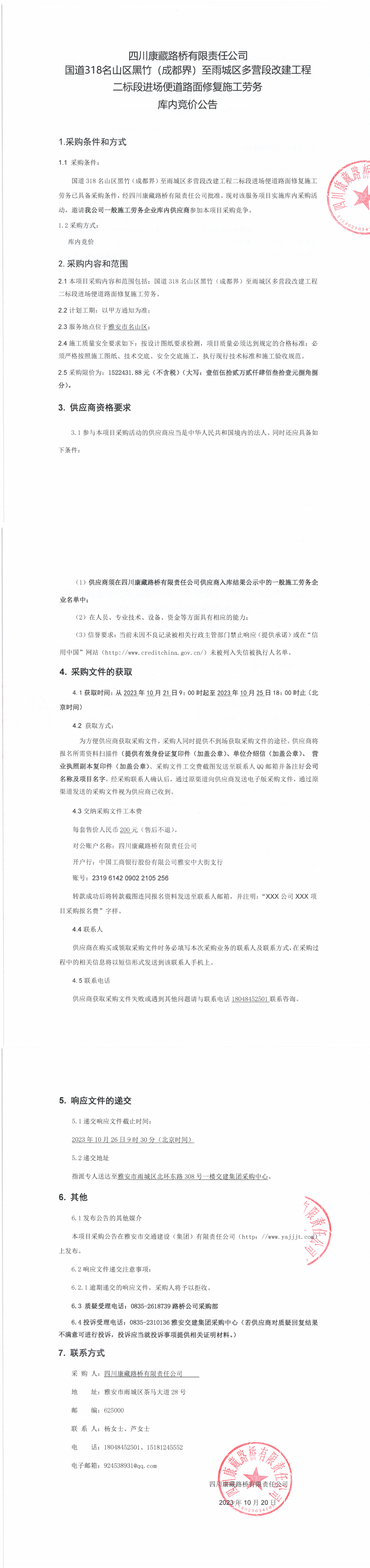 四川康藏路橋有限責任公司國道318名山區(qū)黑竹(成都界)至雨城區(qū)多營段改建工程二標段進場便道路面修復施工勞務(wù)庫內(nèi)競價公告