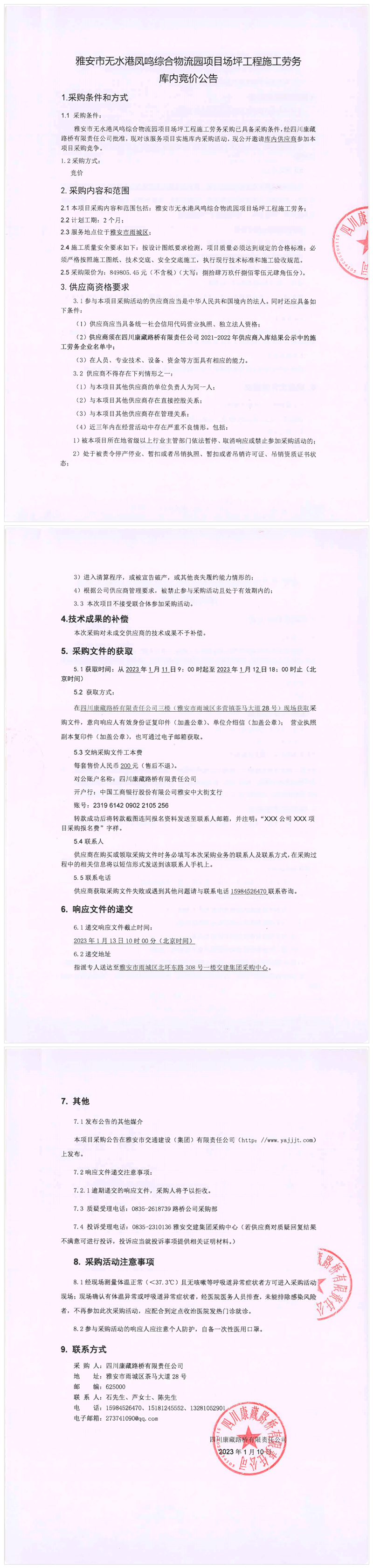 四川康藏路橋有限責任公司雅安市無水港鳳鳴綜合物流園項目場坪工程施工勞務(wù)庫內(nèi)競價公告