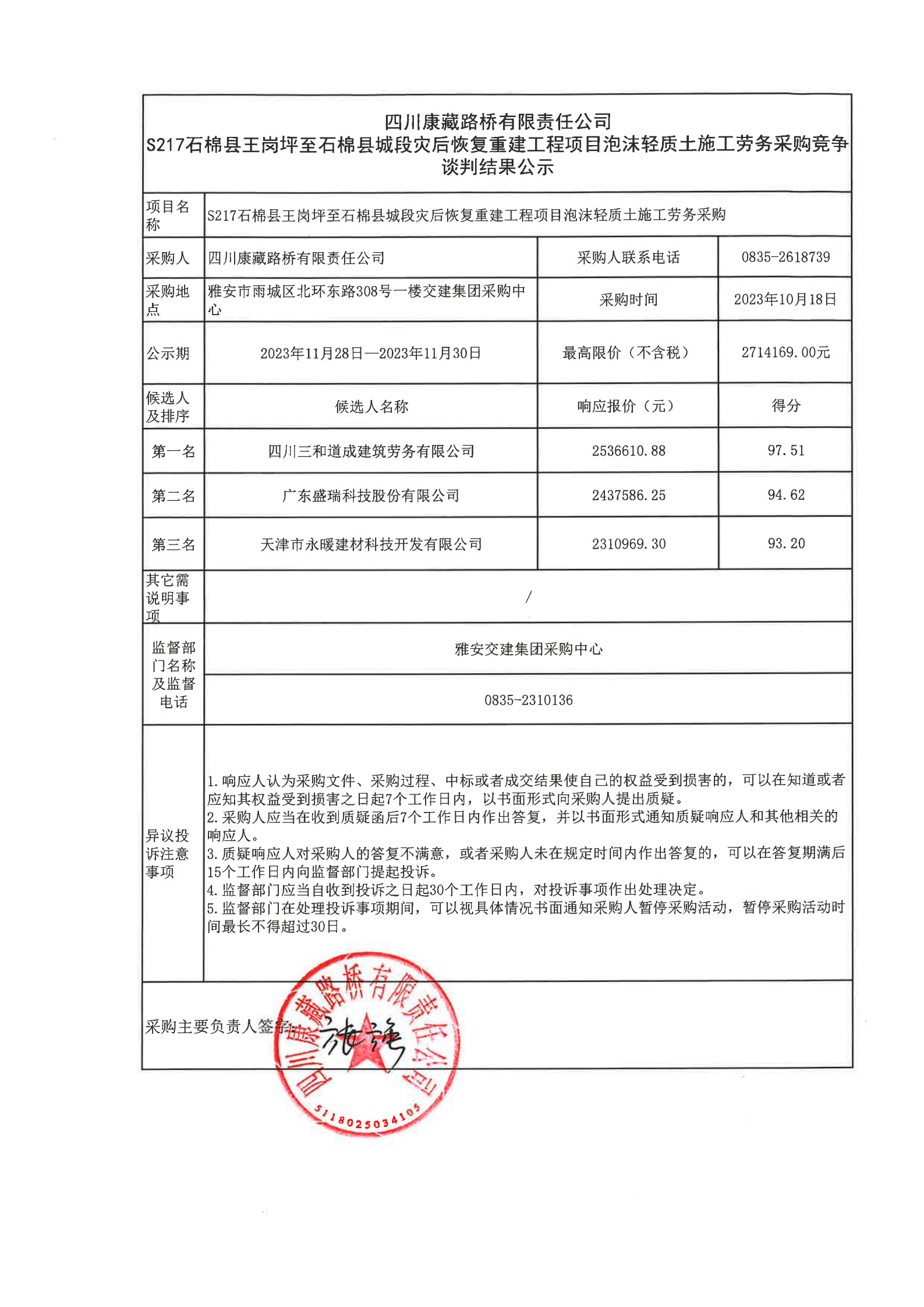 四川康藏路橋有限責任公司S217石棉縣王崗坪至石棉縣城段災后恢復重建工程項目泡沫輕質(zhì)土施工勞務(wù)采購結(jié)果公示