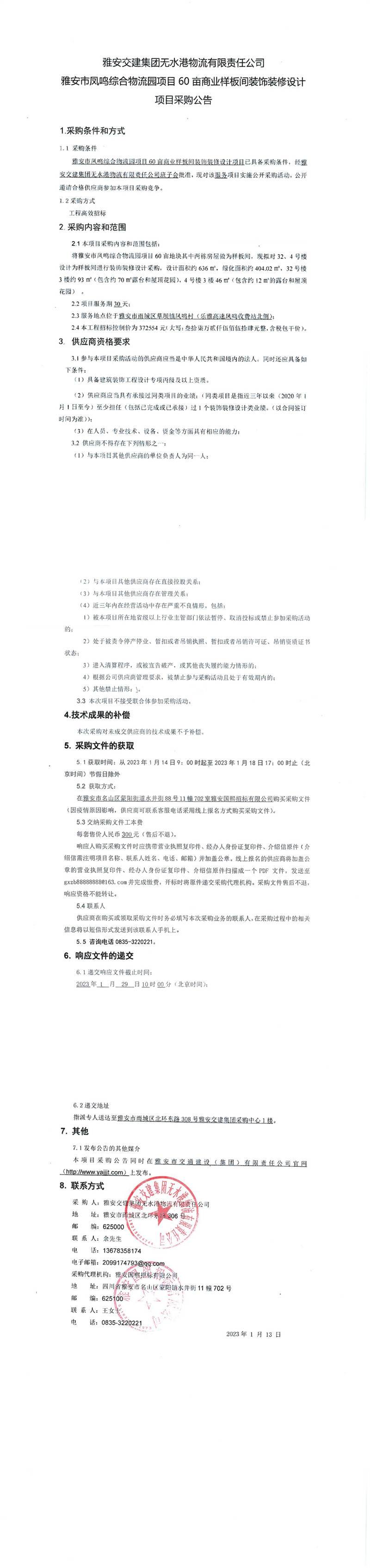 雅安交建集團(tuán)無水港物流有限責(zé)任公司雅安市鳳鳴綜合物流園項目60畝商業(yè)樣板間裝飾裝修設(shè)計項目采購公告