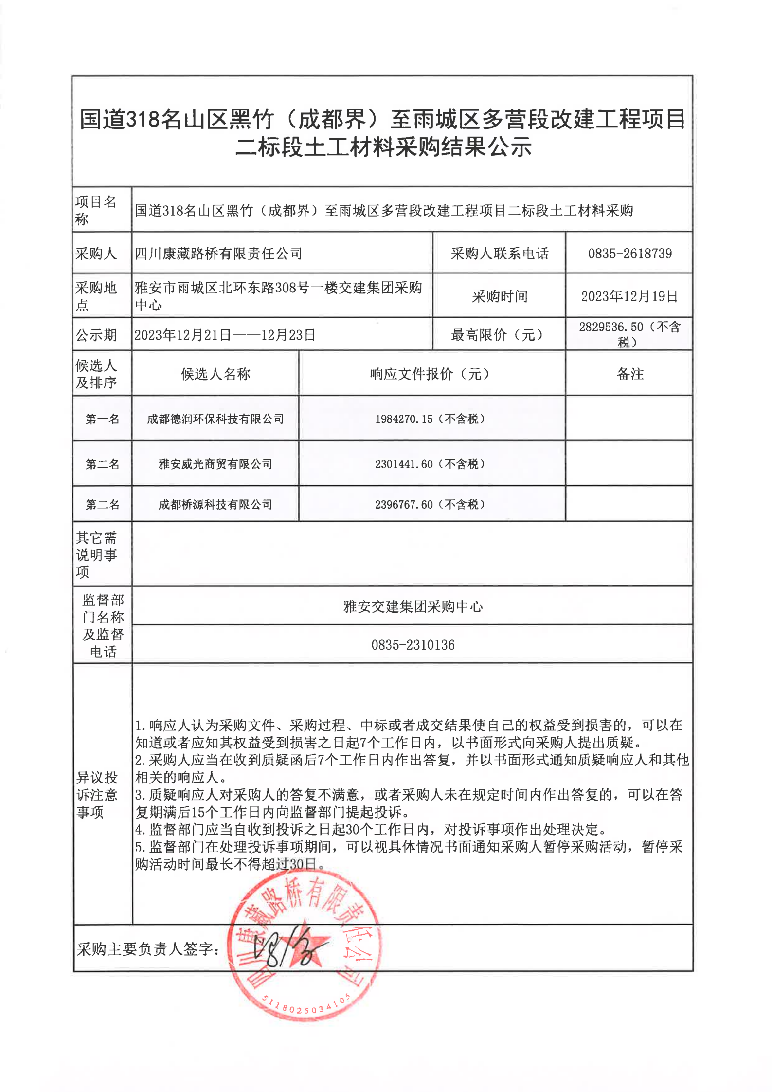 四川康藏路橋有限責任公司國道318名山區(qū)黑竹(成都界)至雨城區(qū)多營段改建工程項目二標段土工材料采購結果公示