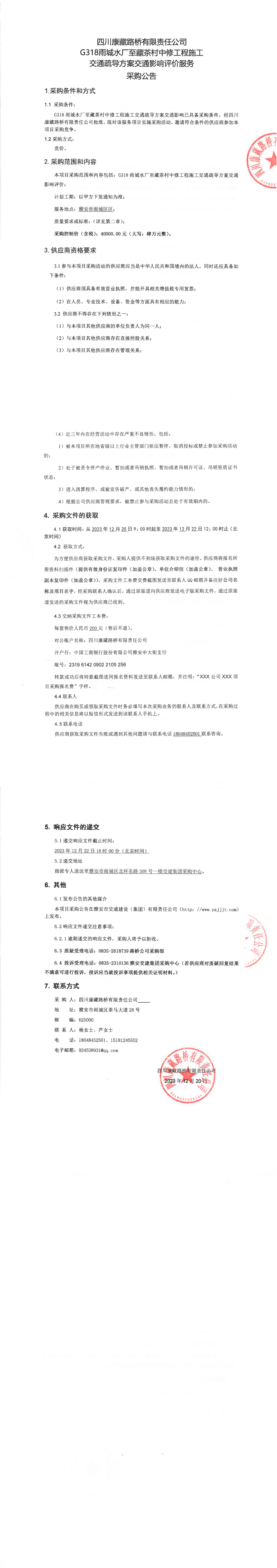 四川康藏路橋有限責(zé)任公司G318雨城水廠至藏茶村中修工程施工交通疏導(dǎo)方案交通影響評價(jià)服務(wù)采購公告