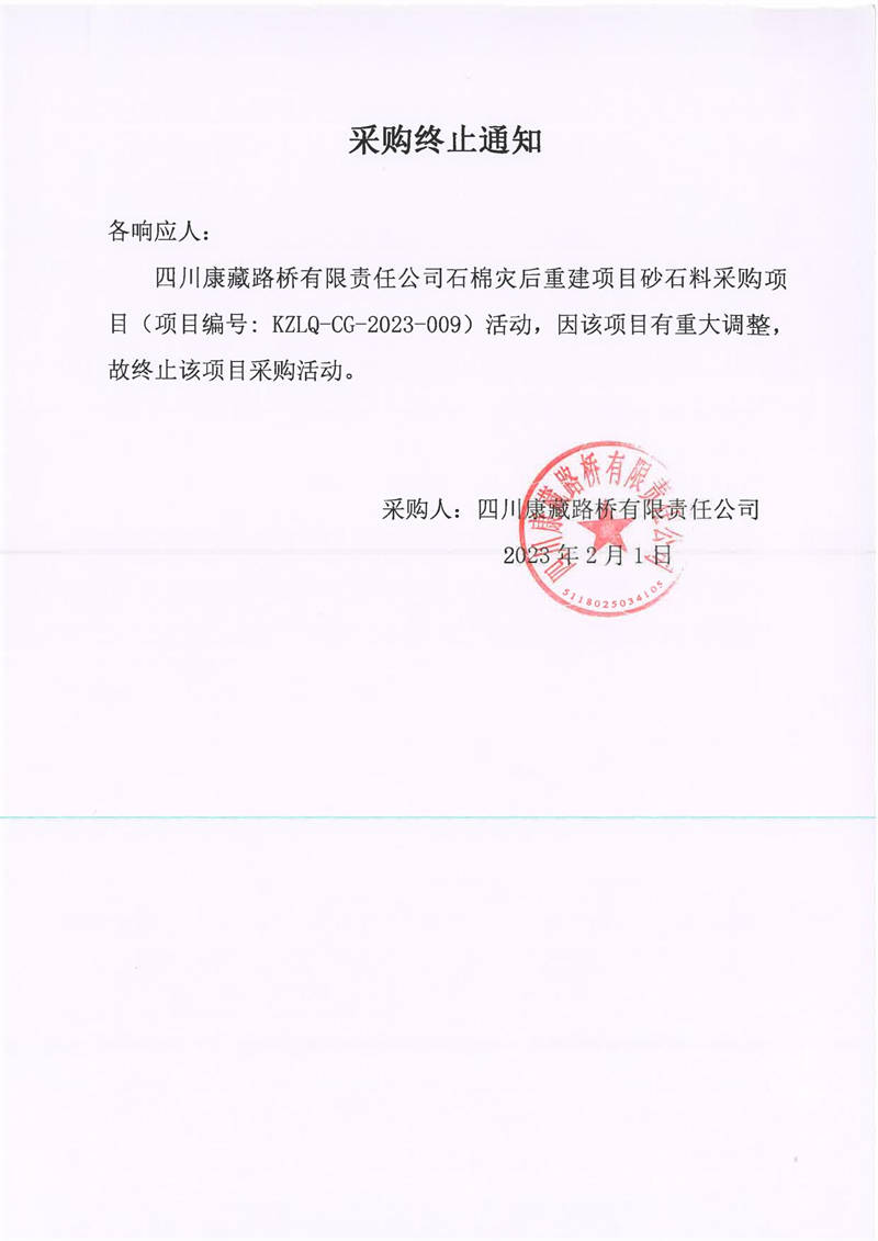四川康藏路橋有限責(zé)任公司石棉災(zāi)后重建項(xiàng)目砂石料采購(gòu)項(xiàng)目采購(gòu)終止通知