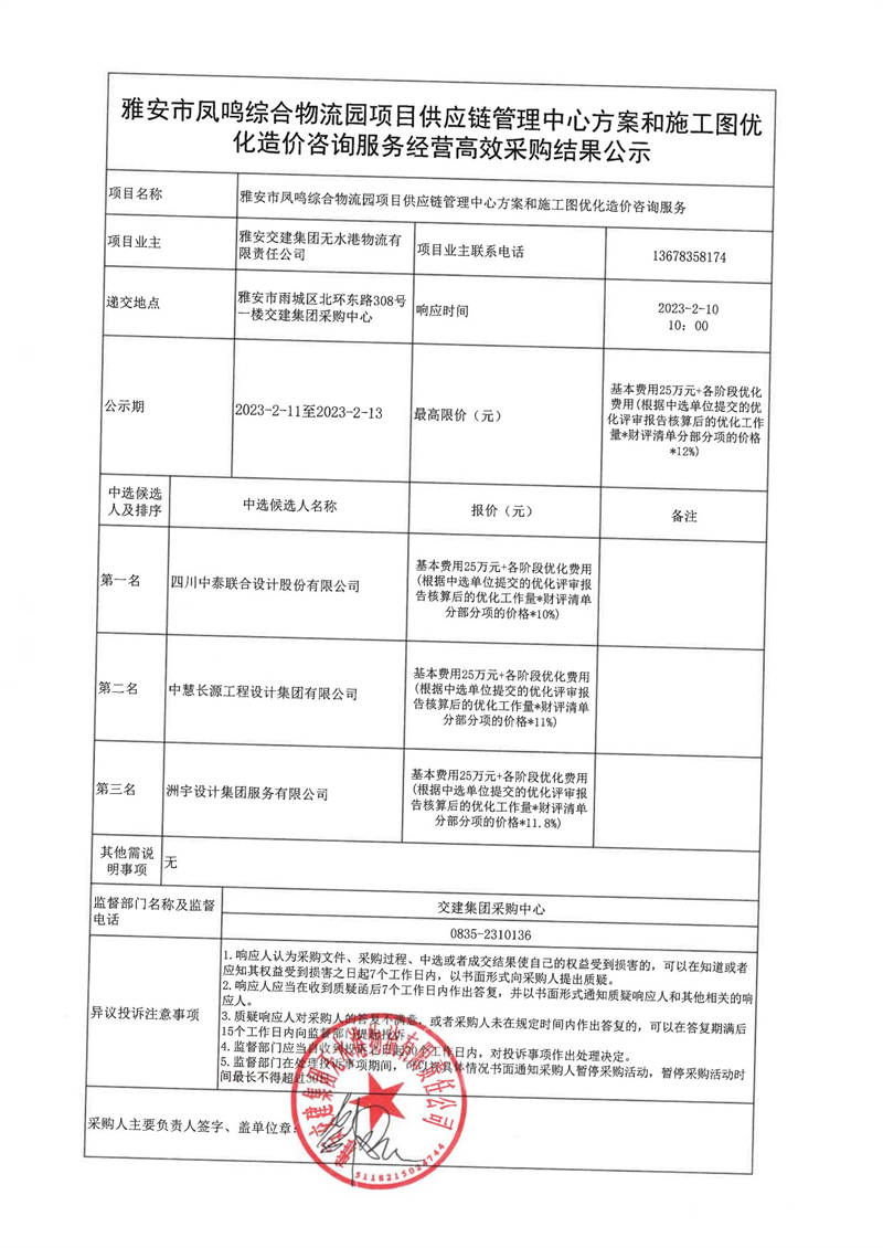 雅安交建集團(tuán)無水港物流有限責(zé)任公司雅安市鳳鳴綜合物流園項目供應(yīng)鏈管理中心方案和施工圖優(yōu)化造價咨詢服務(wù)經(jīng)營高效采購結(jié)果公示