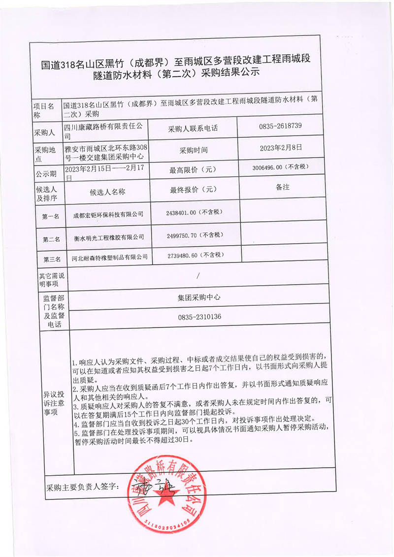 四川康藏路橋有限責任公司國道318線名山區(qū)黑竹(成都界)至雨城區(qū)多營段改建工程雨城段隧道防水材料(第二次)采購