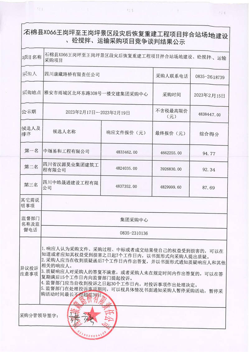 四川康藏路橋有限責(zé)任公司石棉縣X066王崗坪至王崗坪景區(qū)段災(zāi)后恢復(fù)重建工程項目拌合站場地建設(shè)、砼攪拌、運輸采購項目競爭談判結(jié)果公示
