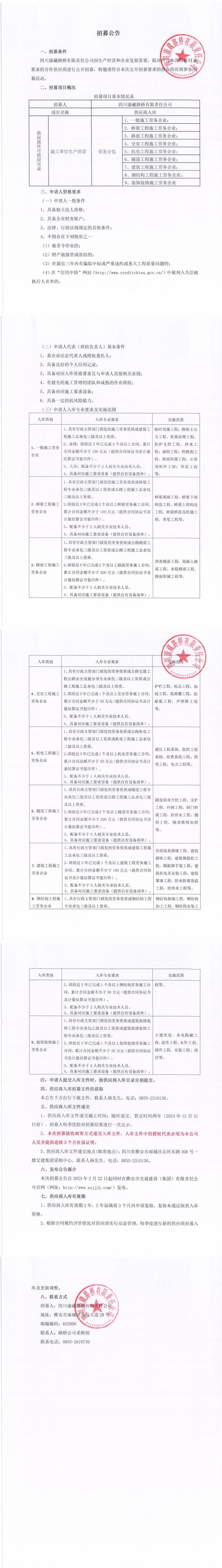 四川康藏路橋有限責任公司2023年供應商入庫(施工單位生產(chǎn)經(jīng)營勞務分包)招募公告