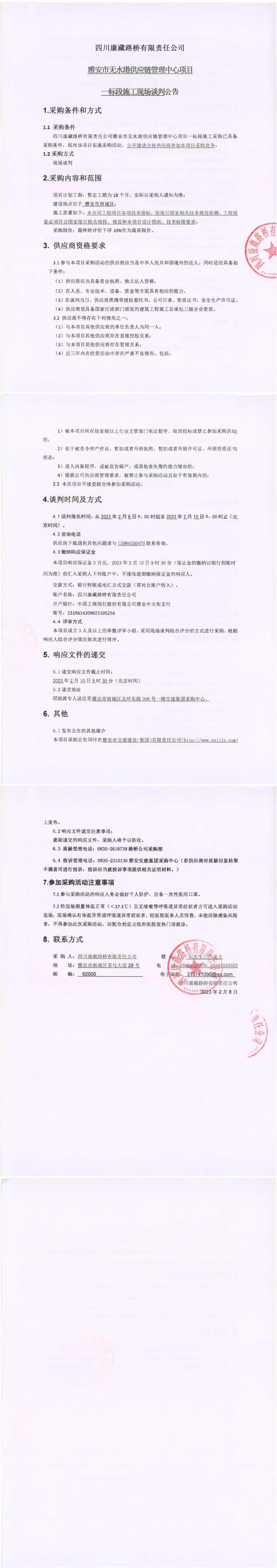 四川康藏路橋有限責任公司雅安市無水港供應鏈管理中心項目一標段施工現(xiàn)場談判公告