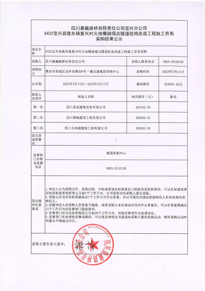 四川康藏路橋有限責(zé)任公司寶興分公司S432寶興縣隴東鎮(zhèn)復(fù)興村火地槽崩塌點(diǎn)隧道駐地改造工程施工勞務(wù)采購(gòu)結(jié)果公示