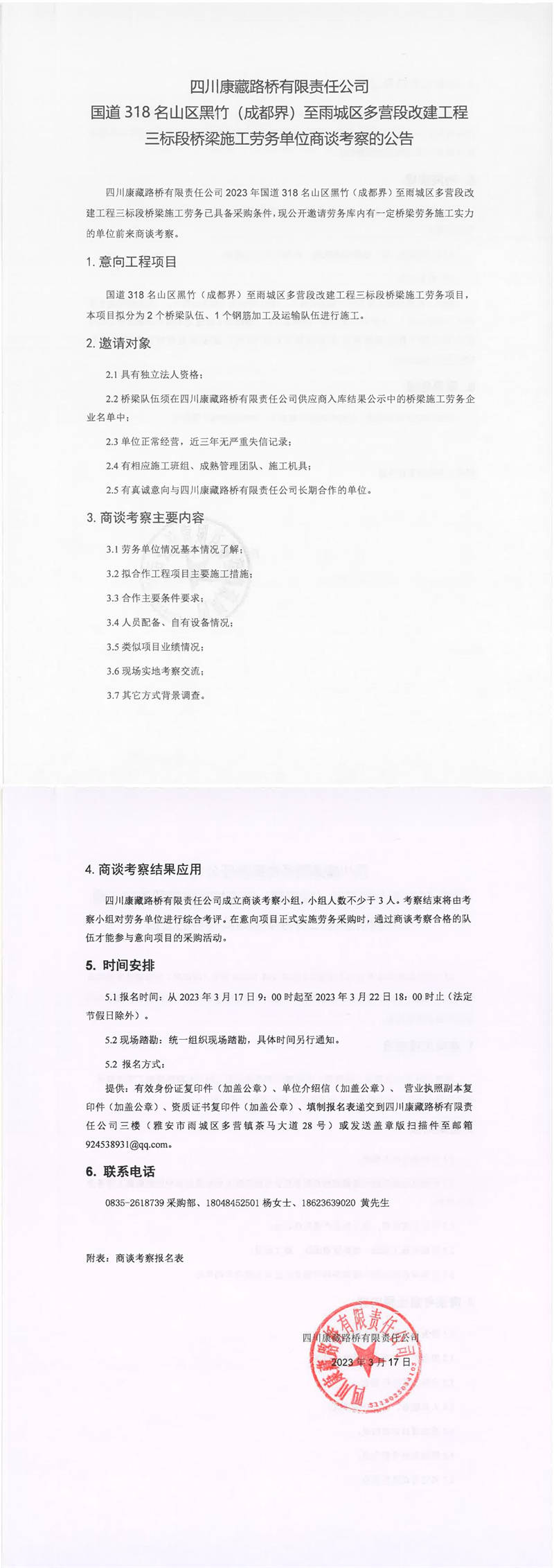四川康藏路橋有限責任公司國道318名山區(qū)黑竹(成都界)至雨城區(qū)多營段改建工程三標段橋梁施工勞務單位商談考察的公告