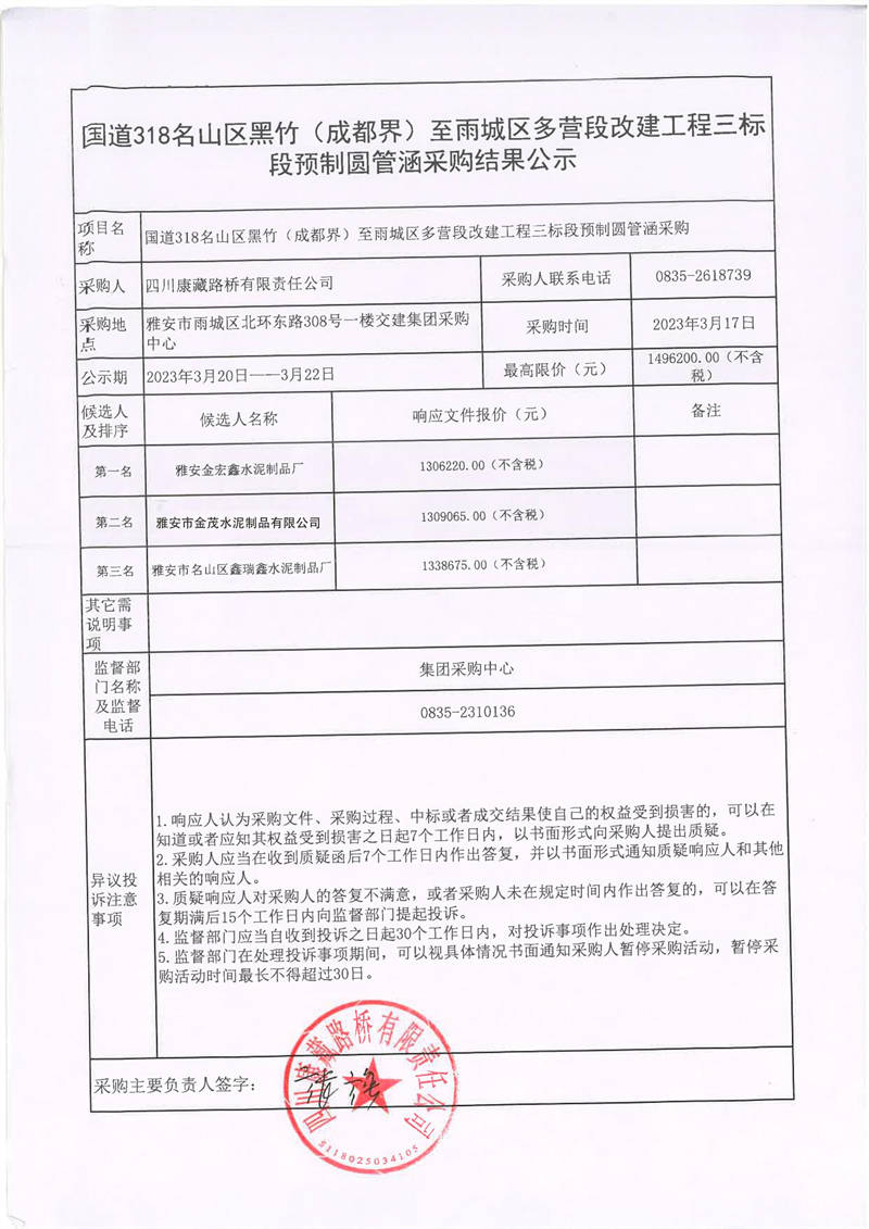 四川康藏路橋有限責任公司國道318名山區(qū)黑竹(成都界)至雨城區(qū)多營段改建工程三標段預制圓管涵采購結(jié)果公示