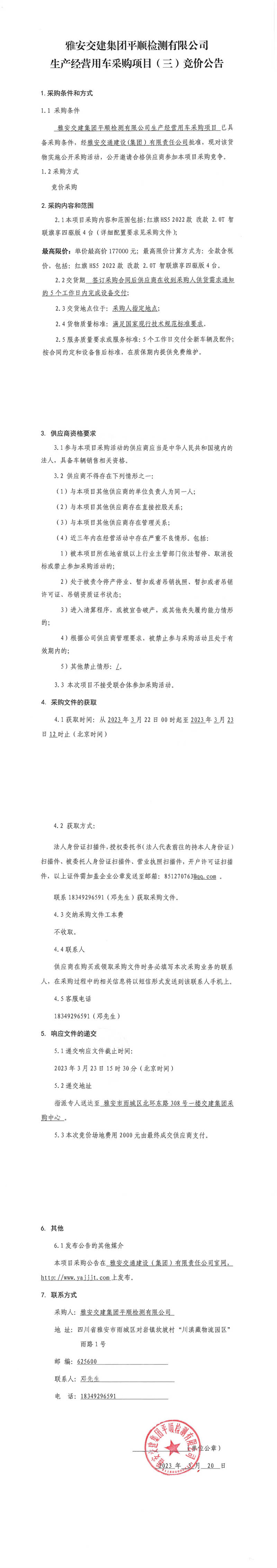 雅安交建集團平順檢測有限公司平順公司生產經營用車采購項目(三)競價公告