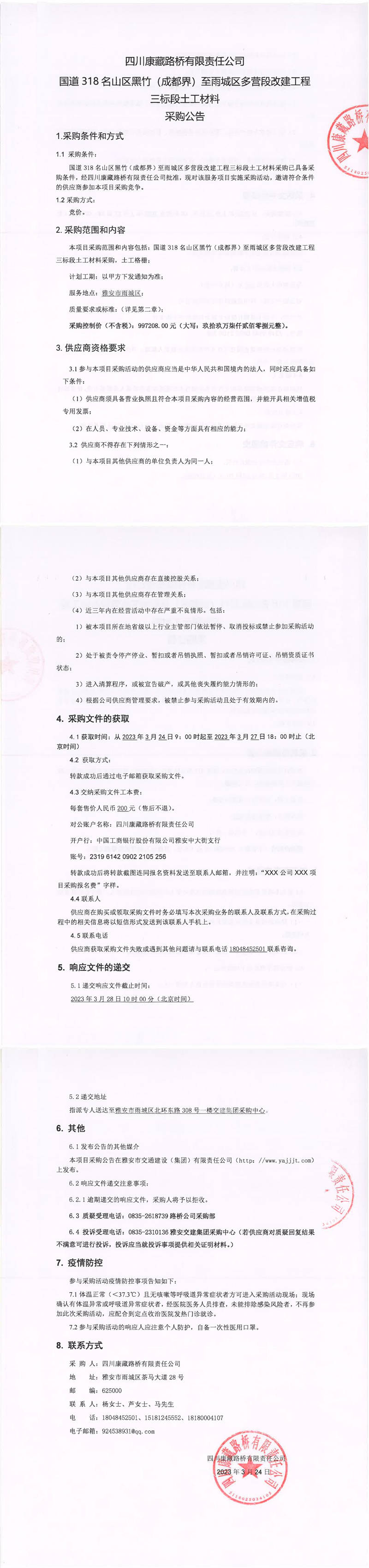 四川康藏路橋有限責(zé)任公司國(guó)道318名山區(qū)黑竹(成都界)至雨城區(qū)多營(yíng)段改建工程三標(biāo)段土工材料采購(gòu)公告
