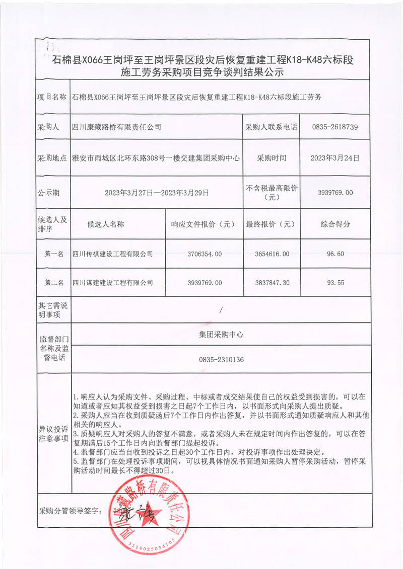 四川康藏路橋有限責(zé)任公司石棉縣X066王崗坪至王崗坪景區(qū)段災(zāi)后恢復(fù)重建工程K18-K48六標(biāo)段施工勞務(wù)采購項目競爭談判結(jié)果公示