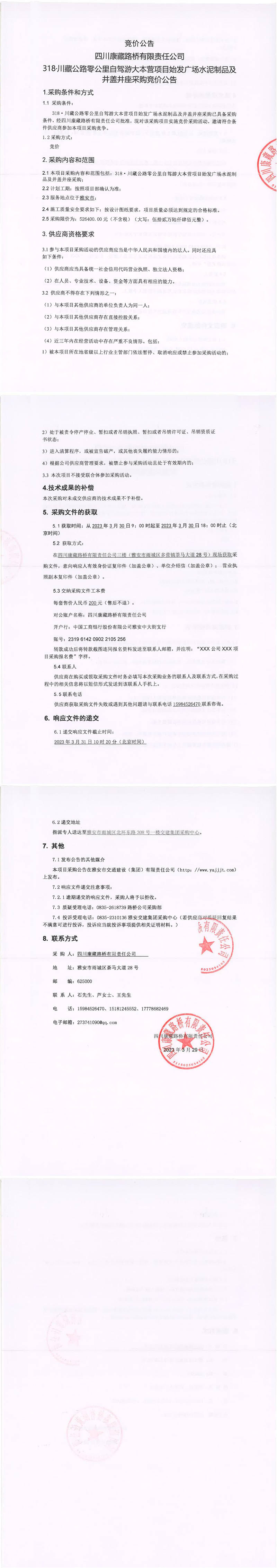 四川康藏路橋有限責任公司318·川藏公路零公里自駕游大本營項目始發(fā)廣場水泥制品及井蓋井座采購競價公告