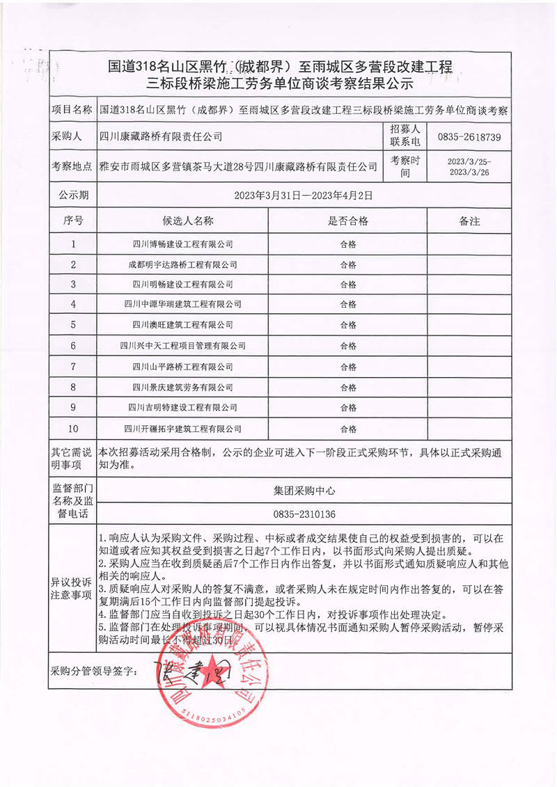 四川康藏路橋有限責(zé)任公司國(guó)道318名山區(qū)黑竹(成都界)至雨城區(qū)多營(yíng)段改建工程三標(biāo)段橋梁施工勞務(wù)單位商談考察結(jié)果公示