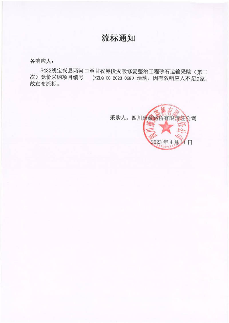 四川康藏路橋有限責(zé)任公司寶興分公司S432寶興縣兩河口至甘孜界段災(zāi)毀修復(fù)整治工程砂石運輸采購(第二次)流標(biāo)通知