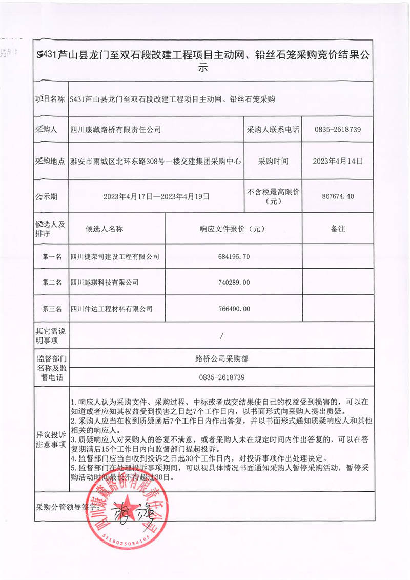 四川康藏路橋有限責(zé)任公司S431蘆山縣龍門至雙石段改建工程項(xiàng)目主動(dòng)網(wǎng)、鉛絲石籠采購競價(jià)結(jié)果公示