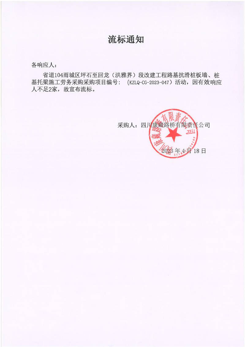 四川康藏路橋有限責任公司省道104雨城區(qū)坪石至回龍(洪雅界)段改建工程路基抗滑樁板墻、樁基托梁施工勞務(wù)流標通知