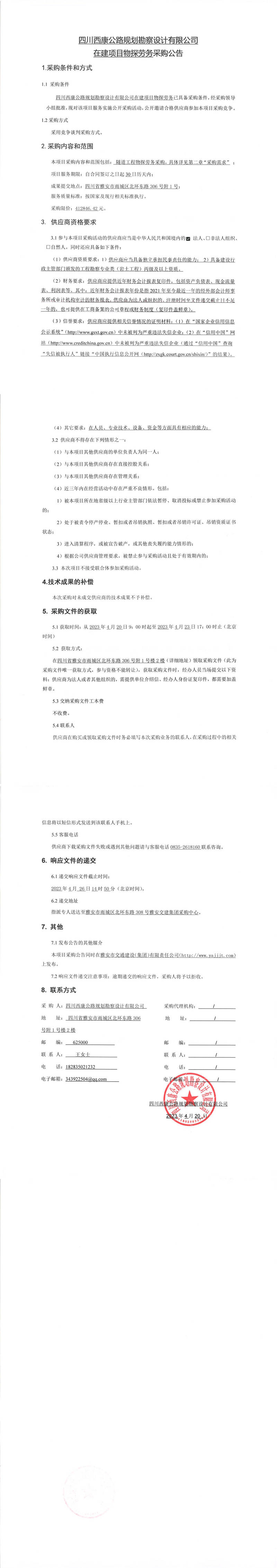 四川西康公路規(guī)劃勘察設(shè)計(jì)有限公司在建項(xiàng)目物探勞務(wù)采購(gòu)公告