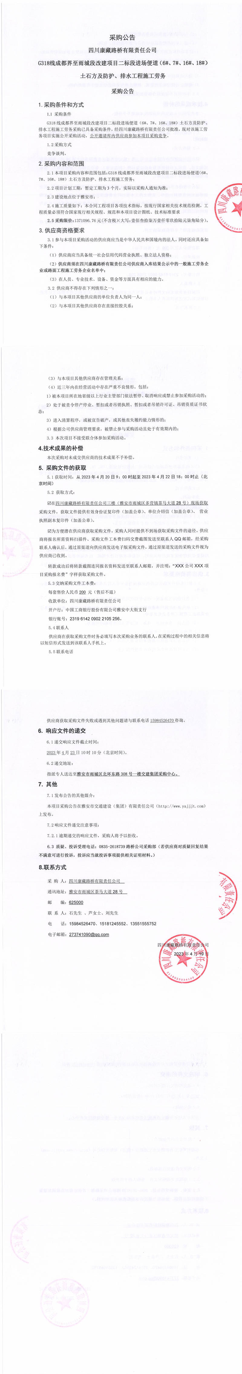 四川康藏路橋有限責(zé)任公司G318線成都至雨城段改建項目二標(biāo)段進(jìn)場便道(6#、7#、16#、18#)土石方及防護(hù)、排水工程施工勞務(wù)