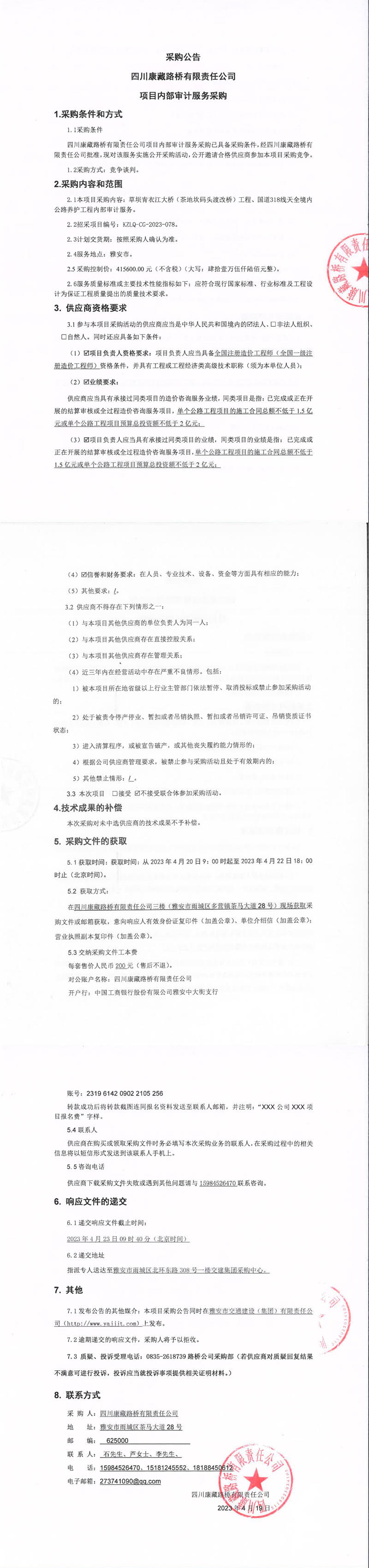 四川康藏路橋有限責(zé)任公司項(xiàng)目內(nèi)部審計(jì)服務(wù)采購公告