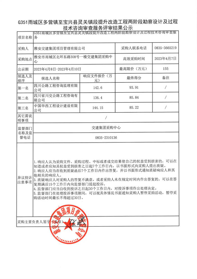 雅安交建集團項目管理有限公司G351雨城區(qū)多營鎮(zhèn)至寶興縣靈關鎮(zhèn)段提升改造工程兩階段勘察設計及過程技術咨詢審查服務評審結果公示